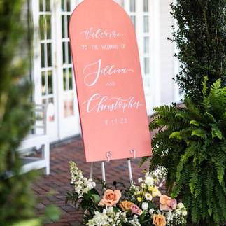 What I Did: This one was quite different than other Bonnet Island weddings I did in 2023. This color scheme went in a totally different direction than the usual blue. Pinks, peaches, and terracotta were huge for Jillian. Invitations were a very modern take with whimsicality in the font — tying in a nude details card, terracotta envelope, and a light pink vellum — ahhh so good! For the rest of the wedding, I tied in gold as an accent color, but everything else was a watercolor ombré (from pink to orange down to the terracotta) for the signature cocktails, table numbers, and photo guestbook. Same for the seating chart, which I hand painted everything in a different color to make it ombre — AH it was SO good! To be different, we did an arched terracotta welcome sign that was just chef’s kiss. Beach-friendly, but not blue and white in-your-face typical beach wedding vibe.