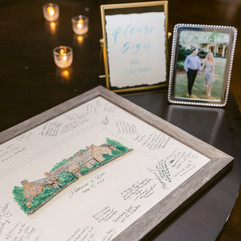 What I Did: I used my painting for the invitations, which featured dusty blue and light sage greens. Welcome bag had an itinerary card and timeline. Rehearsal dinner info included in some of the invitations. I used deckled paper for the signage — and gave it a modern flair by putting it behind acrylic. Killed it — brought it to a different level providing dimension and texture. Looked incredible in front of the clock. For small signage I worked in a gold accent color. Signature cocktails signage had a watercolor theme like venue painting. Place cards were watercolor dusty blue with gold calligraphy. Small signs same. For the guestbook, they used my original watercolor and guests got to sign it — so good!