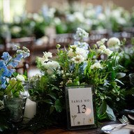 What I Did: This couple wanted to feature their blue and white florals. The seating chart was literally an incredible flower box — I printed all of the place cards, and Diane placed them in. I have always wanted someone to do this, and I was so thrilled that they did. Paired it with an acrylic sign in their colors. Consistency without being matchy-matchy. For the invitation suite, we used gold foil and a deep dusty blue envelope with my watercolor of Clark’s Landing in the liner. Programs and Menus featured the same look. Sea glass table numbers with wood stand to tie in the wood flower box seating chart. Signature Cocktail sign was clear acrylic with blue lettering.